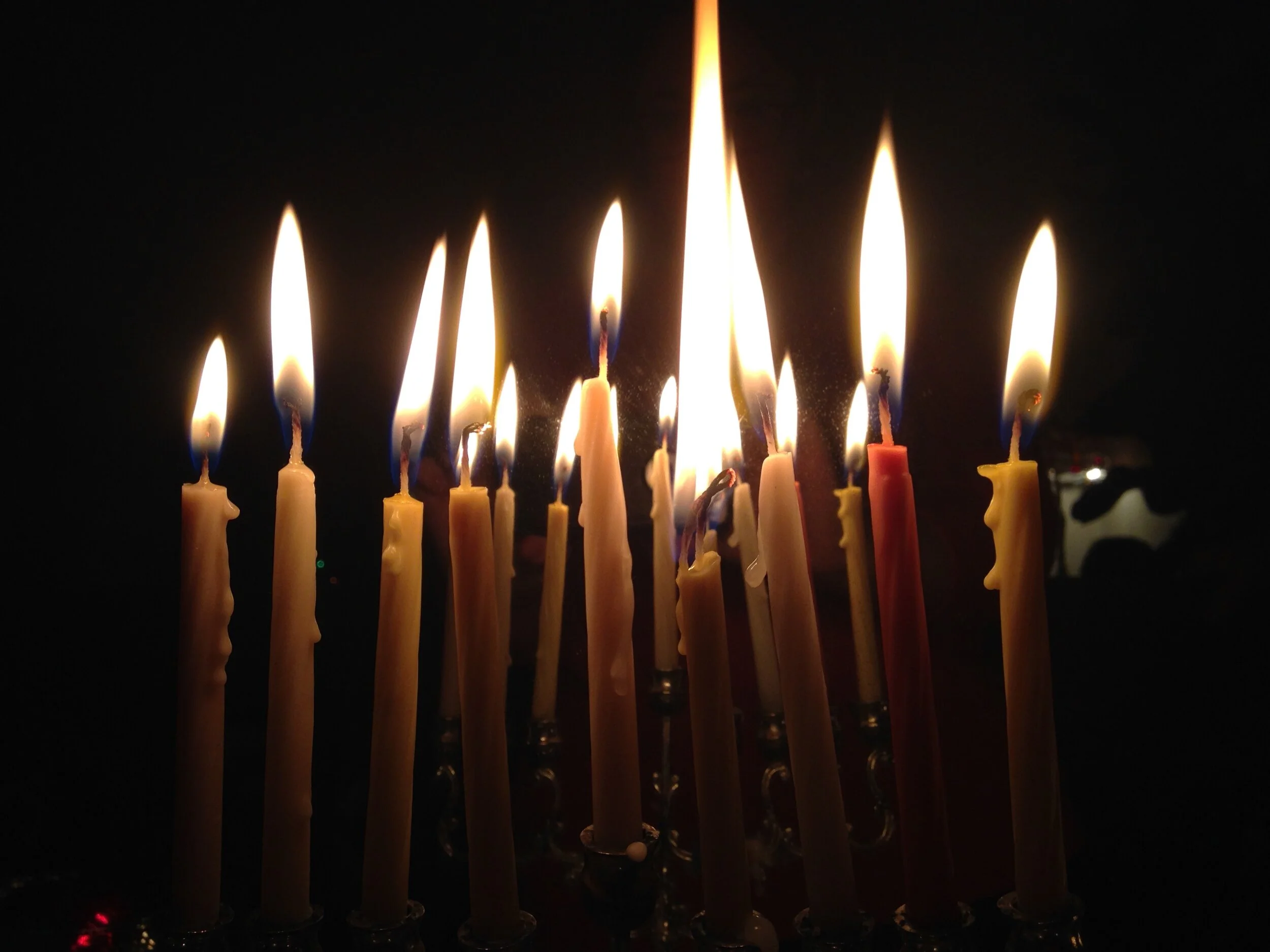 But one year, my parents accidentally brought long-lasting candles to the service, the no-drip kind that burn for hours. I’ll never forget the sight of all the other candles having long melted away, our menorah with its candles not even half way down, and all the families waiting to charge down to the banquet hall for donuts and coffee, glaring at the menorah with the lights that just would not go out. My parents’ disastrous misjudgment mortified me, and I pretended I did not know them.